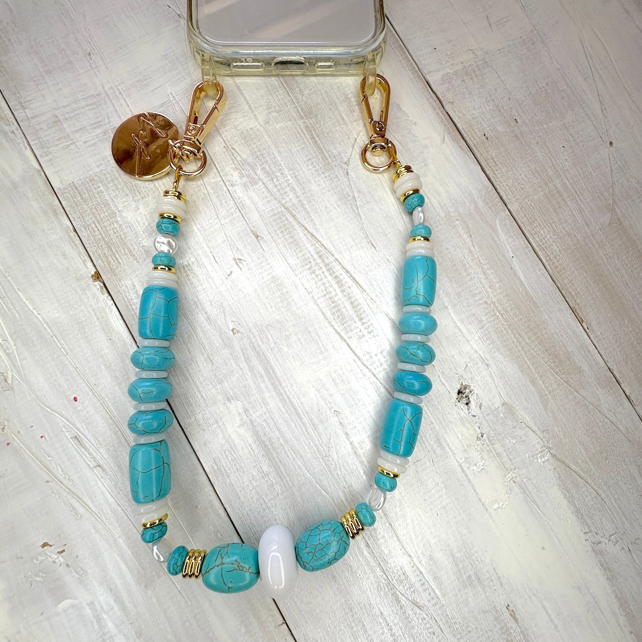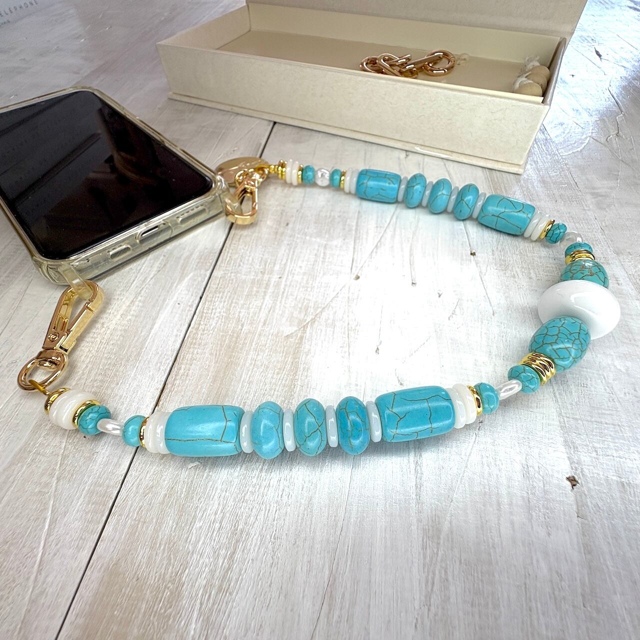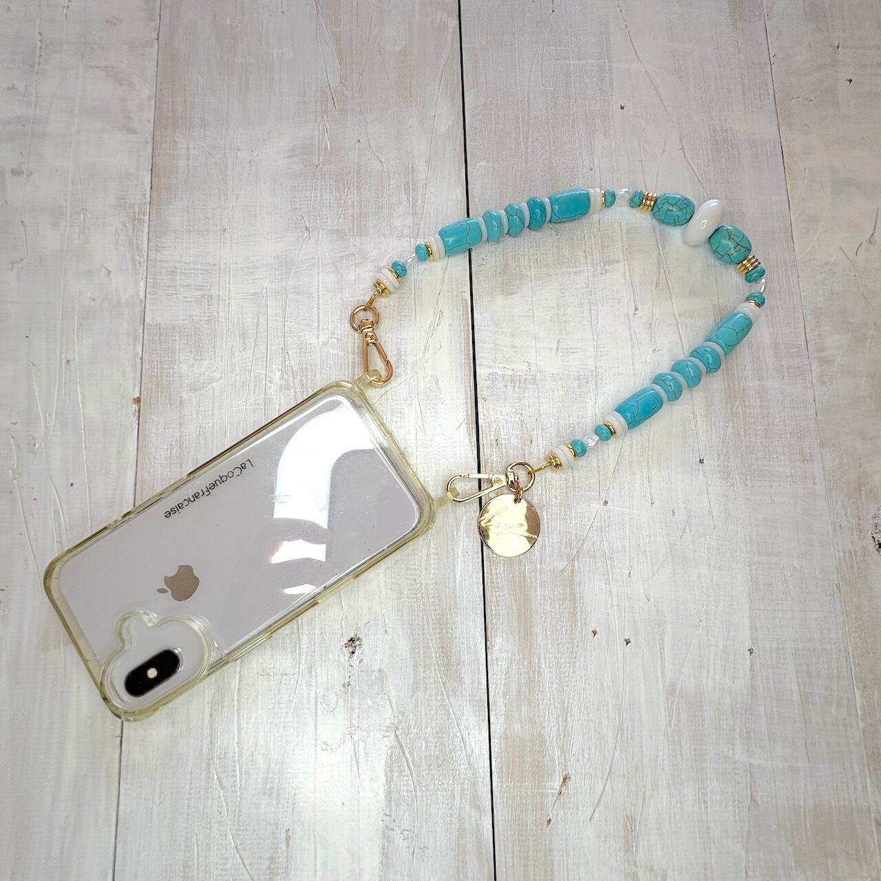 南フランスのスマホ・アクセサリーのブランドLa Coque Fran?aise(ラコックフランセーズ)のCLEO。半貴石のシリーズで、ターコイズ石と乳白色のビーズ、ゴールドのカラビナの組み合わせは大人の余裕を感じさせるニュアンス感あふれるデザイン。