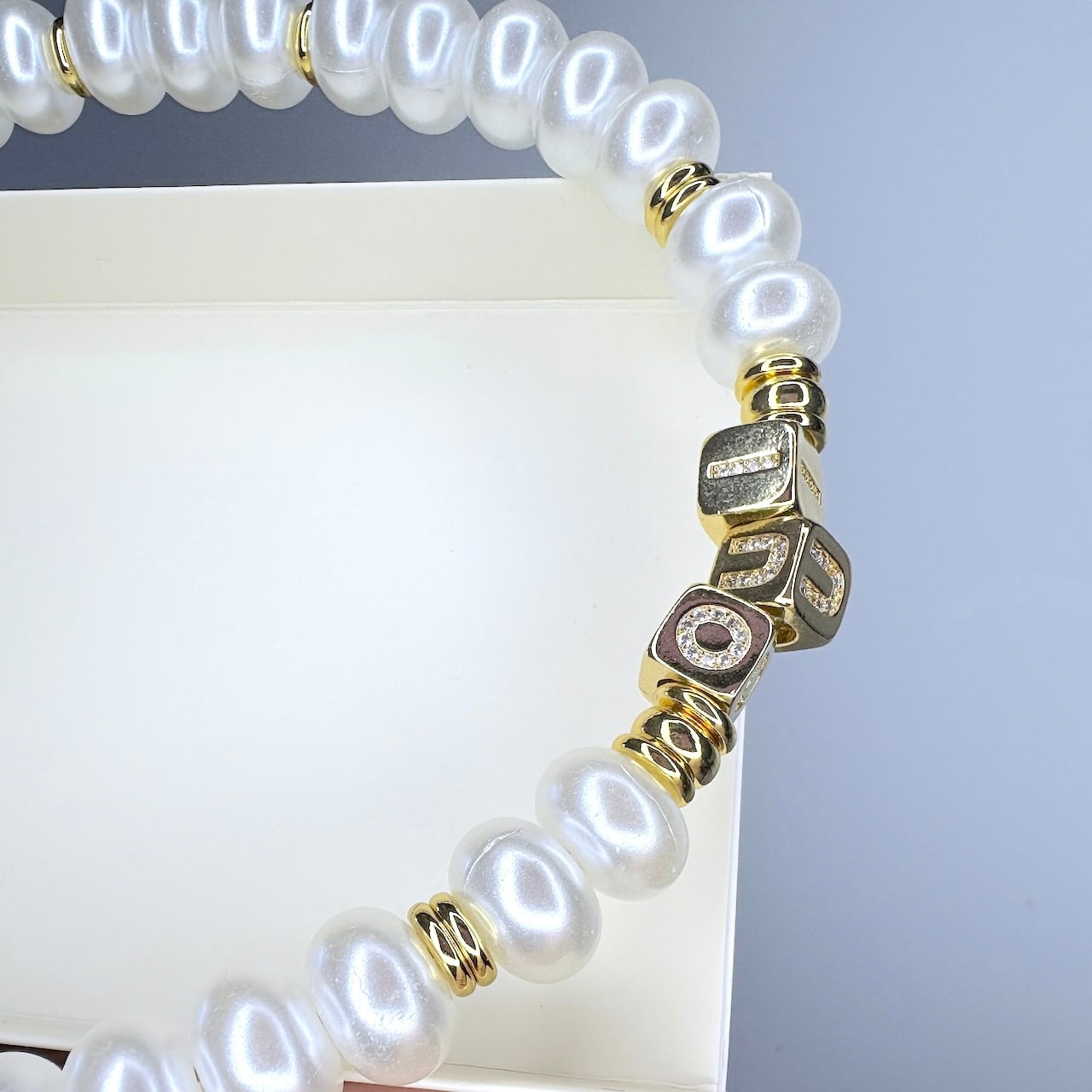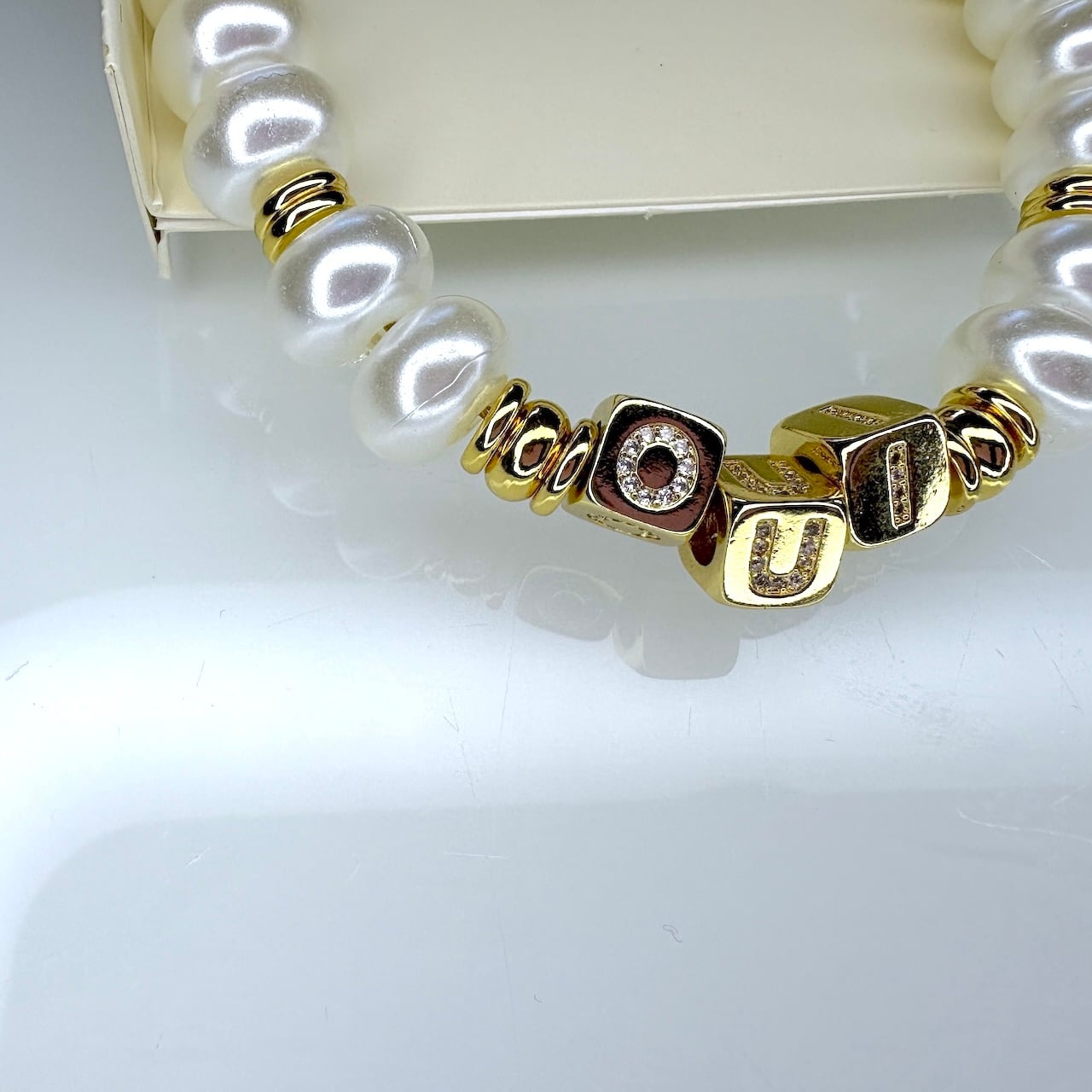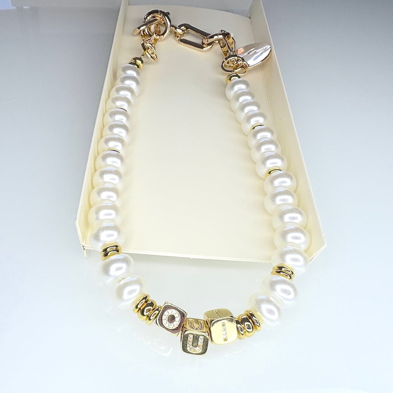 レジンパールとゴールドに埋め込まれたゴールドに埋め込まれたラインストーンでOUI の文字が埋め込まれ、キラキラとダイヤモンドのように輝きます。細かな手作業で作られた人気のデザイン。