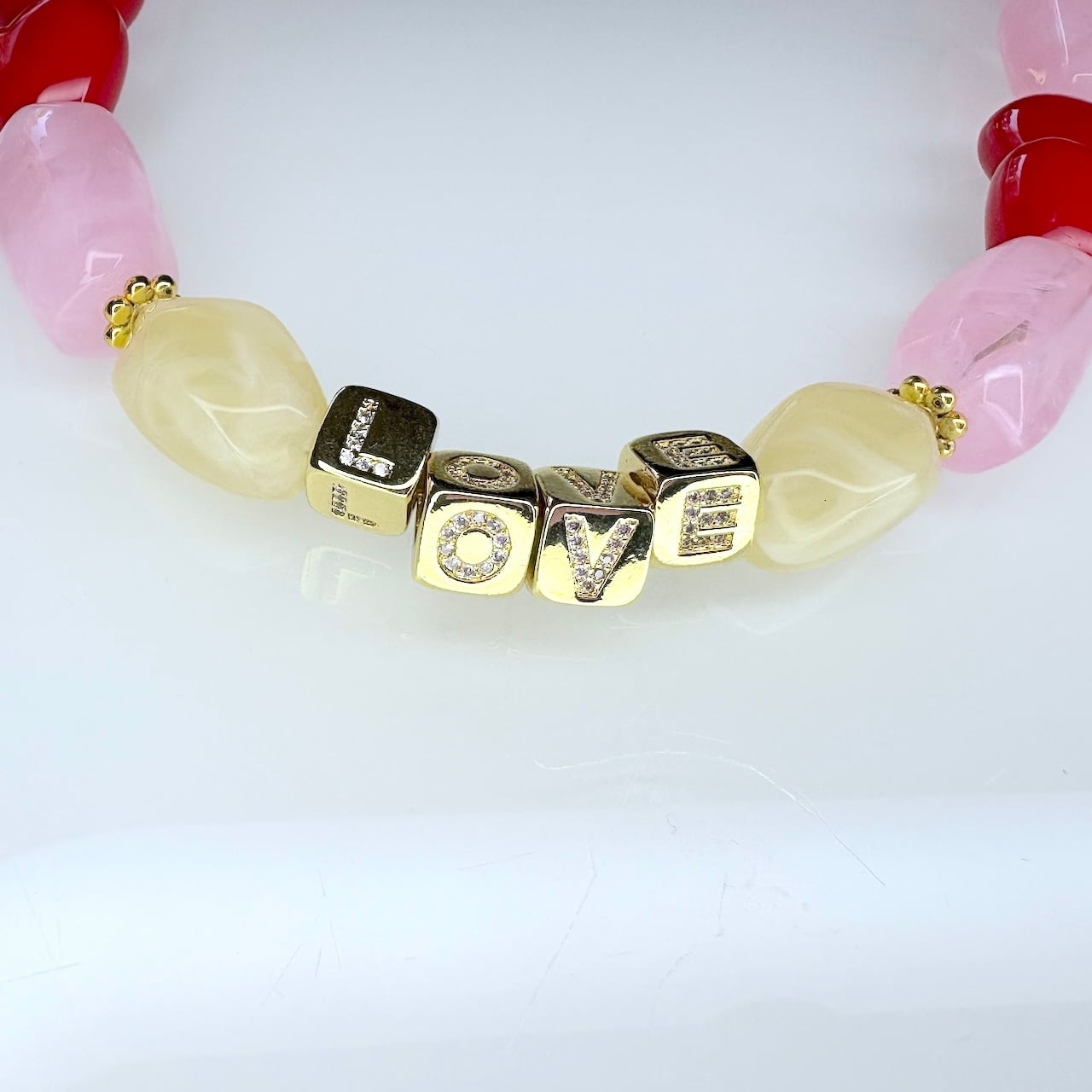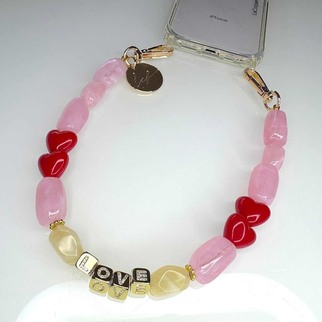 レジンパールとゴールドに埋め込まれたラインストーンでLOVE の文字が埋め込まれ、キラキラとダイヤモンドのように輝きます。