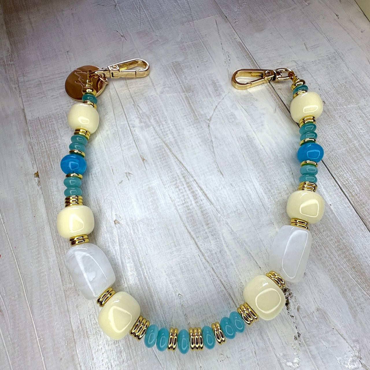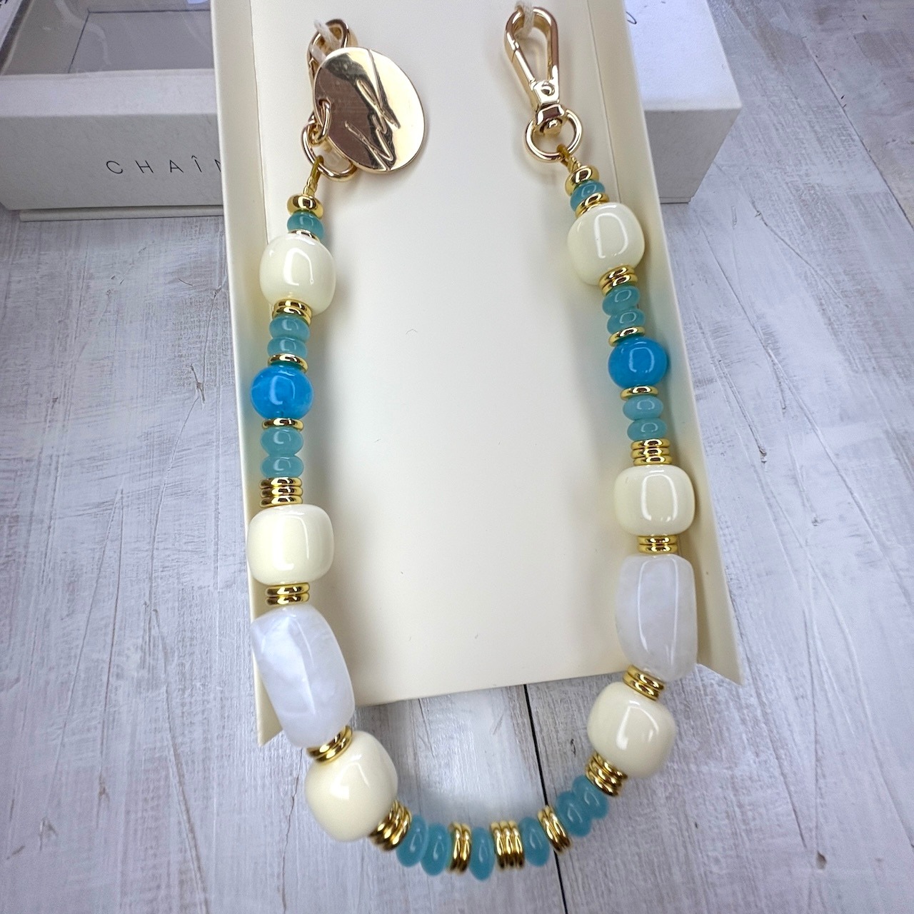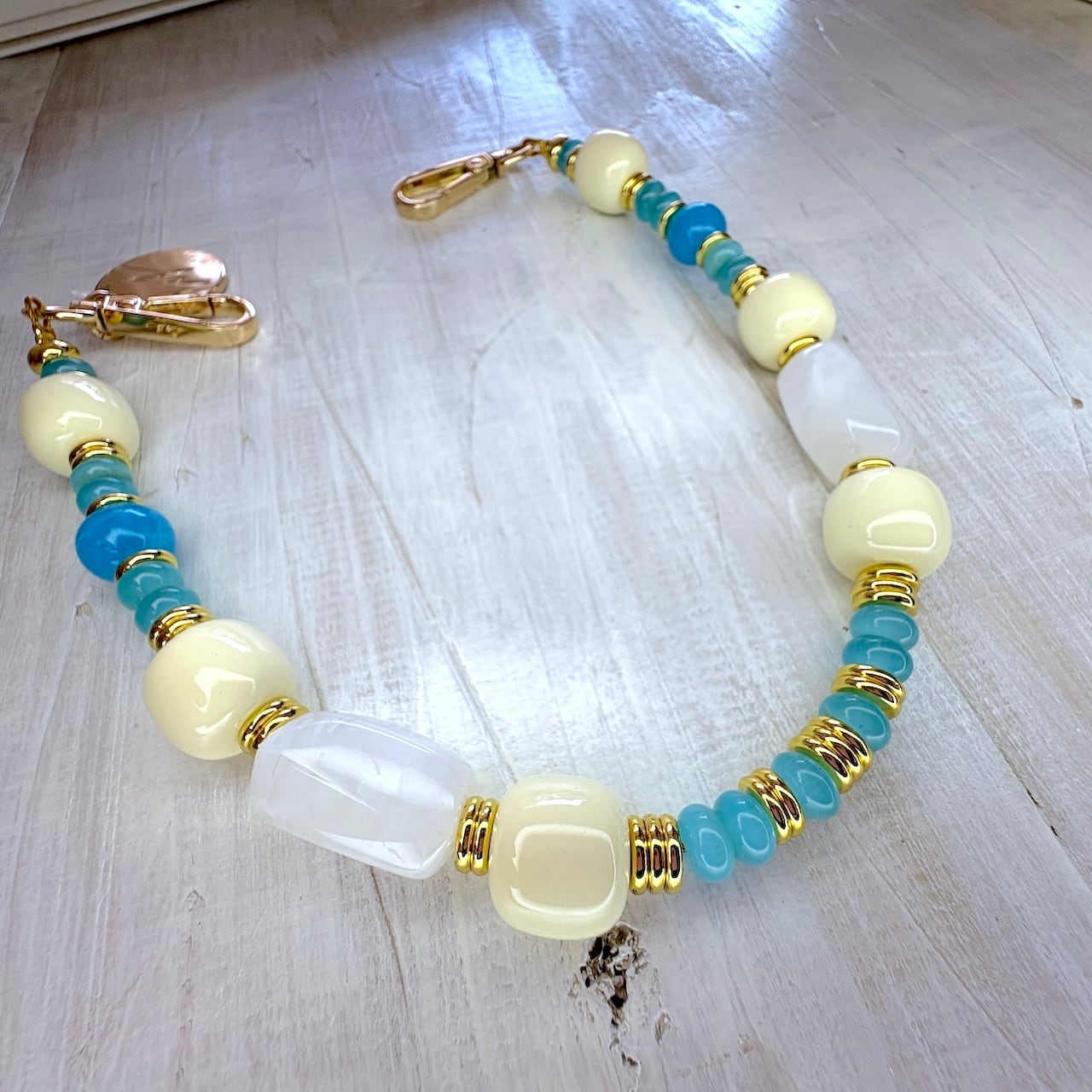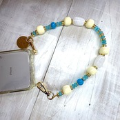 半貴石のシリーズで、ターコイズ石と天然石のような乳白色のビーズ、ゴールドのカラビナの組み合わせです。