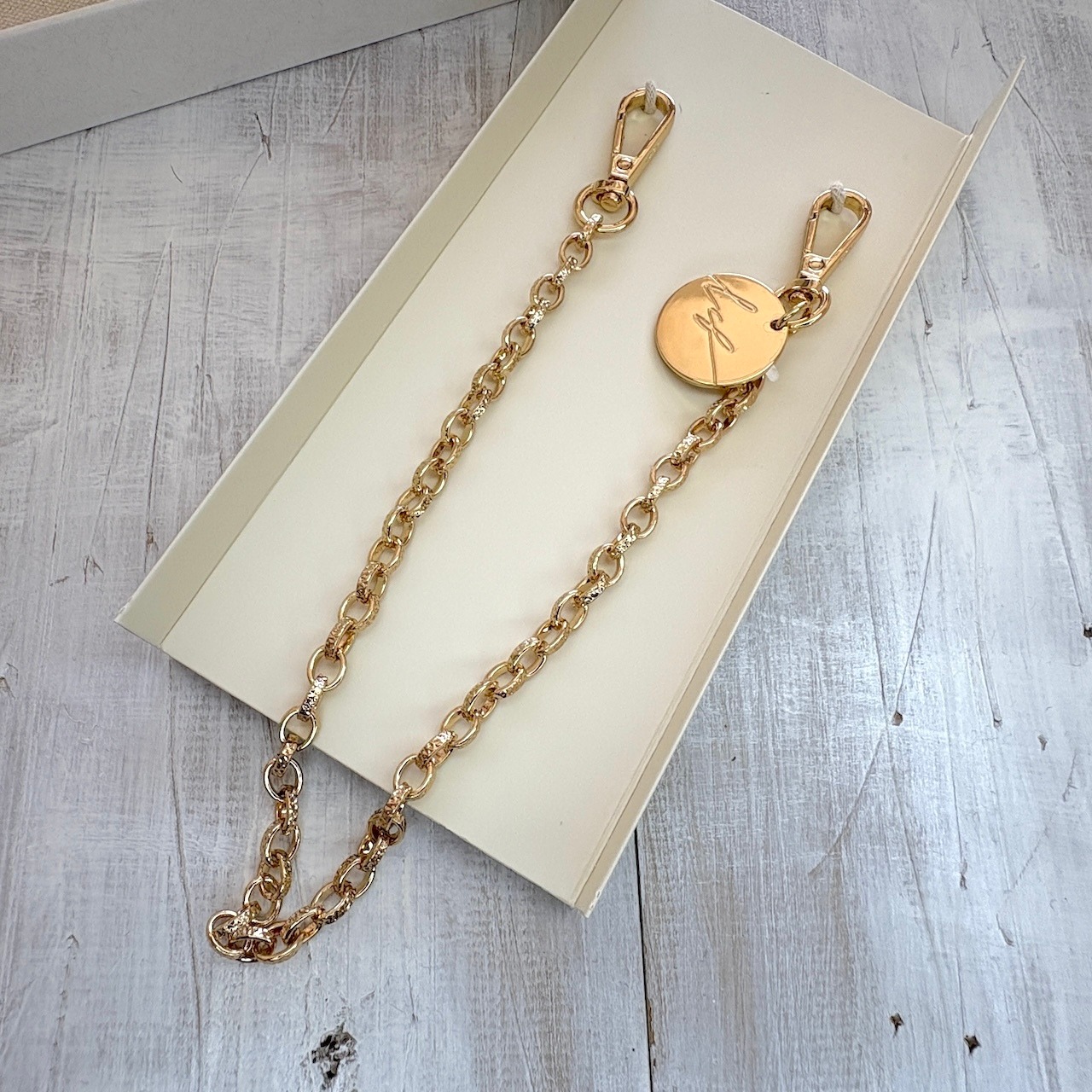 フランス・マルセイユのアトリエで丁寧に仕上げられたこのストラップは、ゴールドチェーンの上品な光沢と、ブランドアイコンが刻まれた丸型メタルチャームが特徴です。