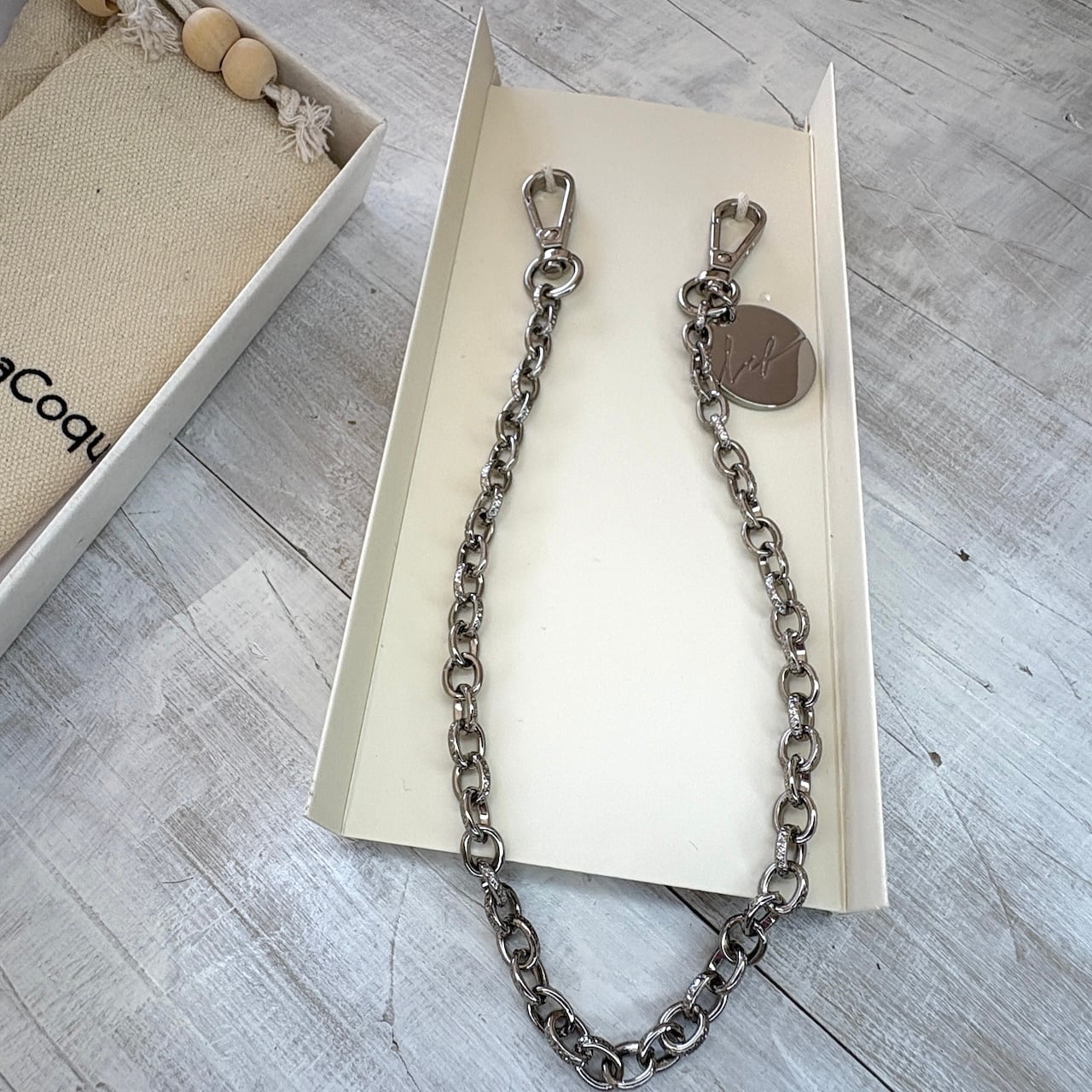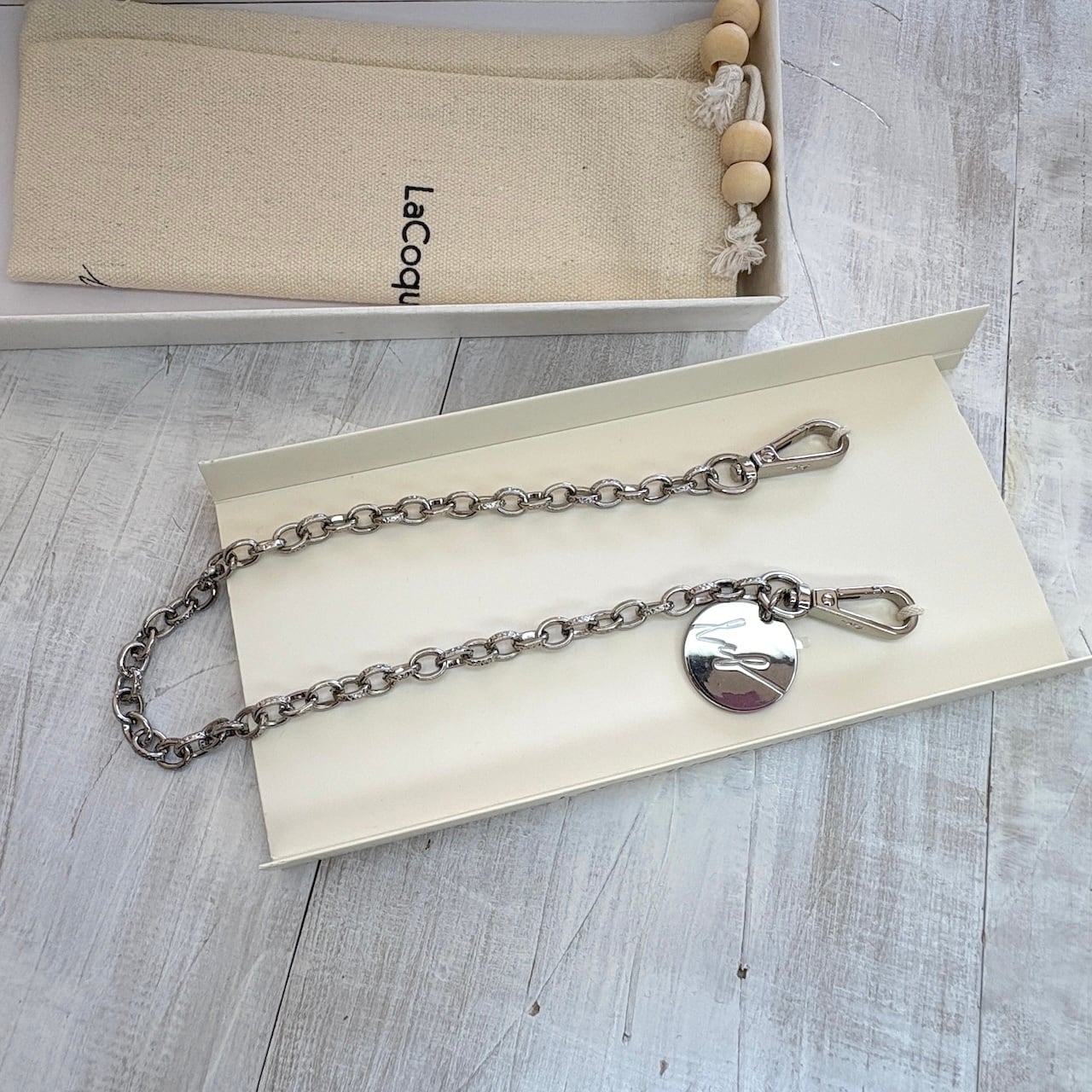 洗練された輝きでコーディネートを引き締める、La Coque Française(ラコックフランセーズ)の40cmシルバーショートストラップ。