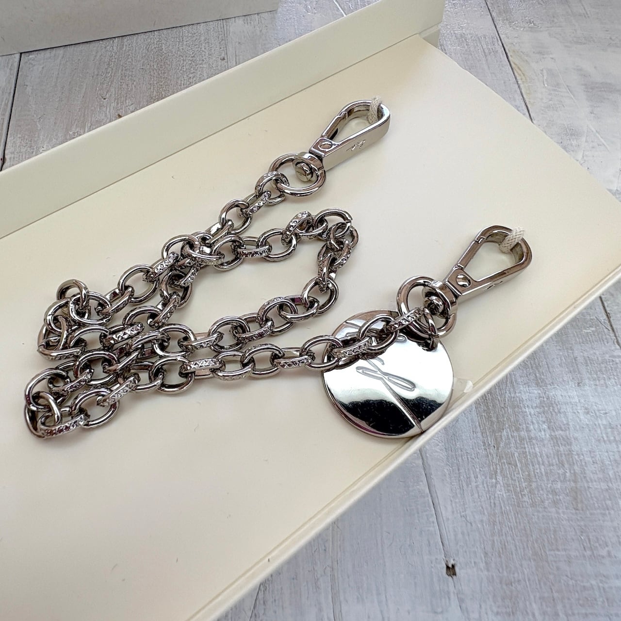 チェーンは適度な重みと滑らかな質感で、ジュエリーのような高級感。