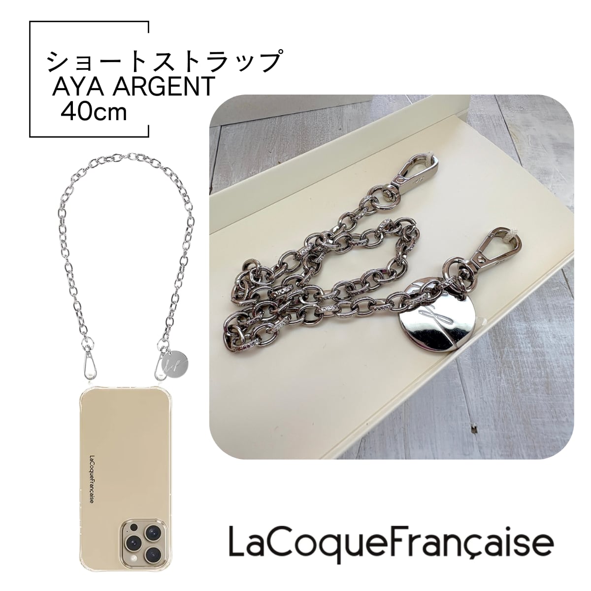 【AYA ARGENT アヤ・アルジャン】40cm ラコックフランセーズ スマホストラップ シルバー メタル ショートストラップ La Coque Francaise