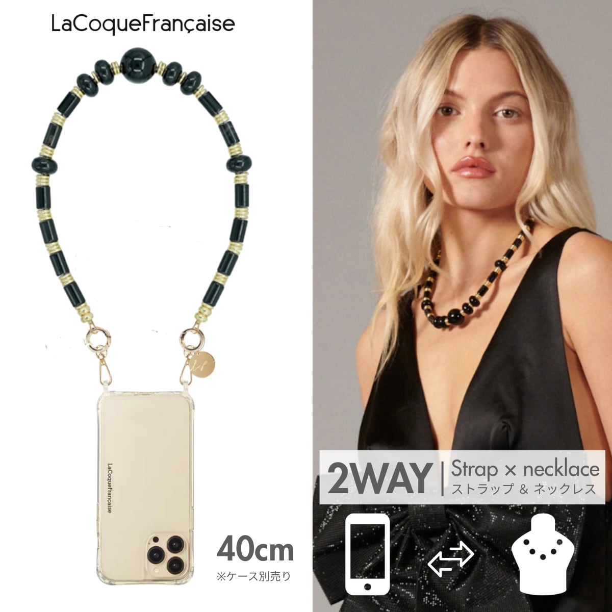 【 LEIA NOIR レイア・ノワール】40cm ラコックフランセーズ フランス製 ハンドメイド スマホストラップ ネックレス La Coque Francaise