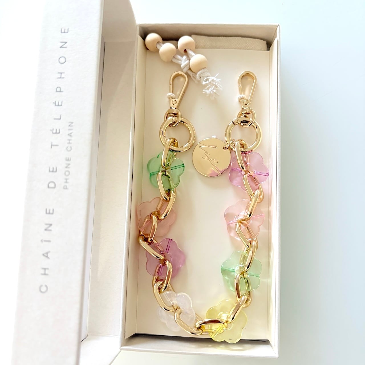 軽やかなパステルトーンをゴールドチェーンが優雅にまとめ、甘すぎず上品に仕上げています。