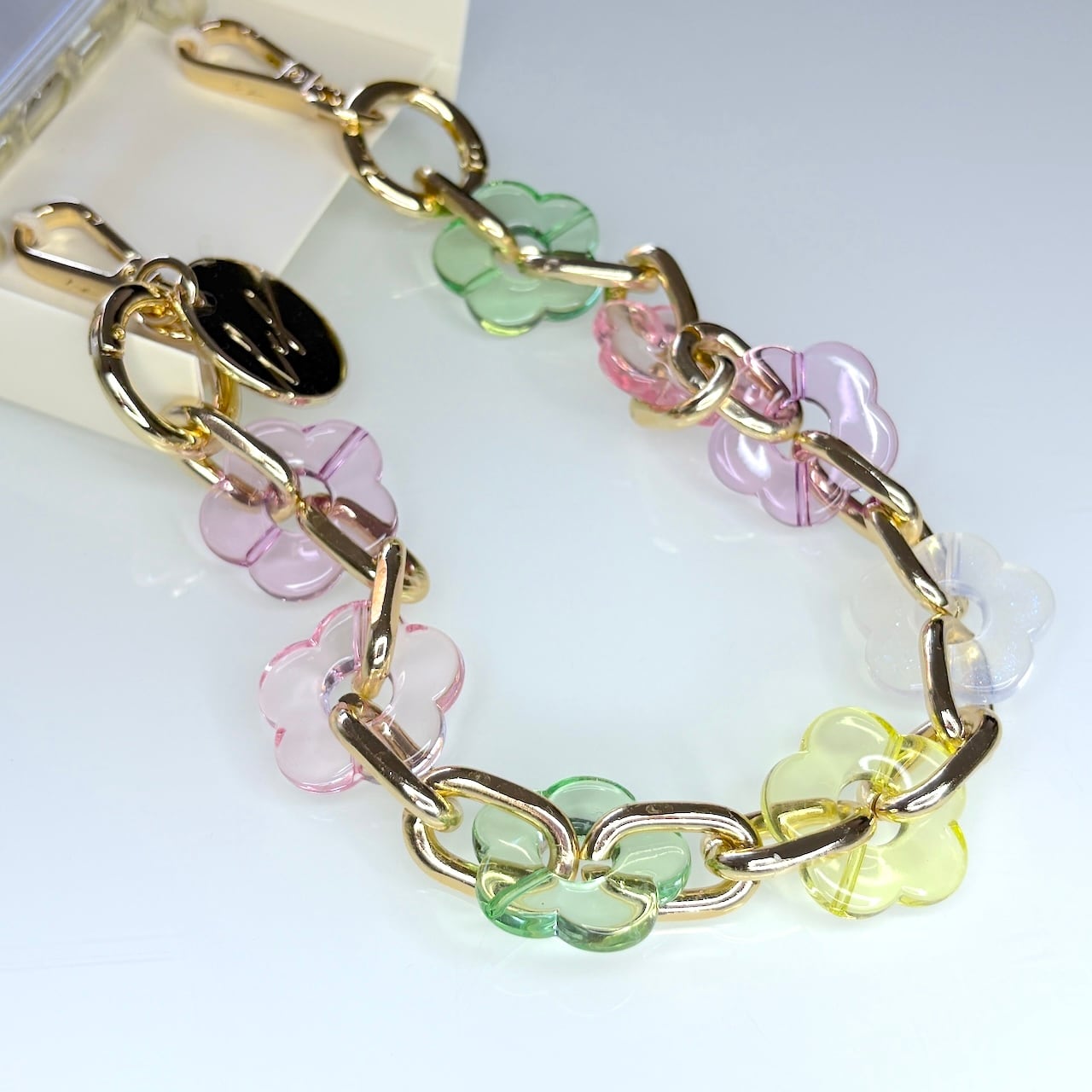柔らかく透き通るようなパステルカラーのフラワーモチーフが連なり、手元に春の光が差し込むようなやさしい輝きを添える
