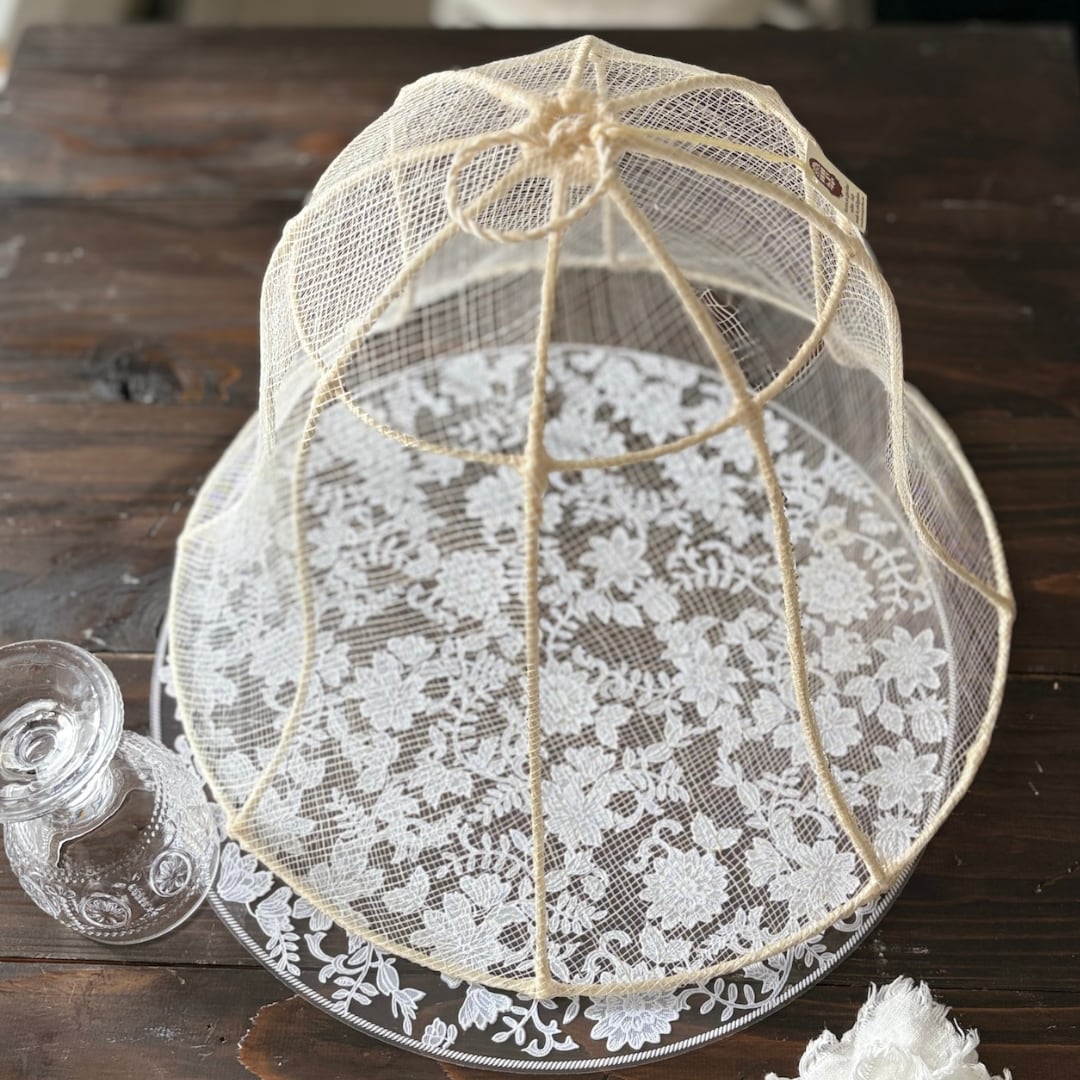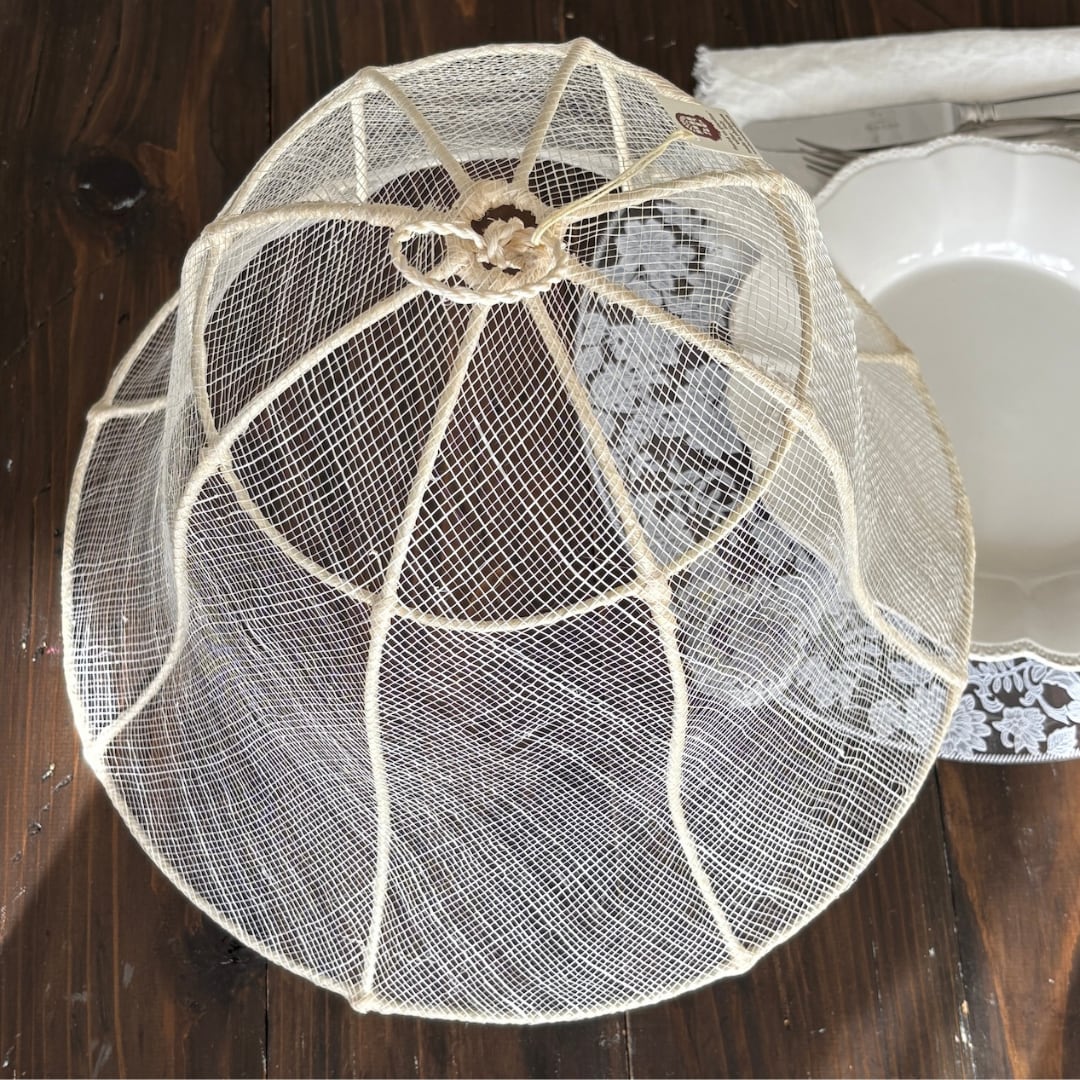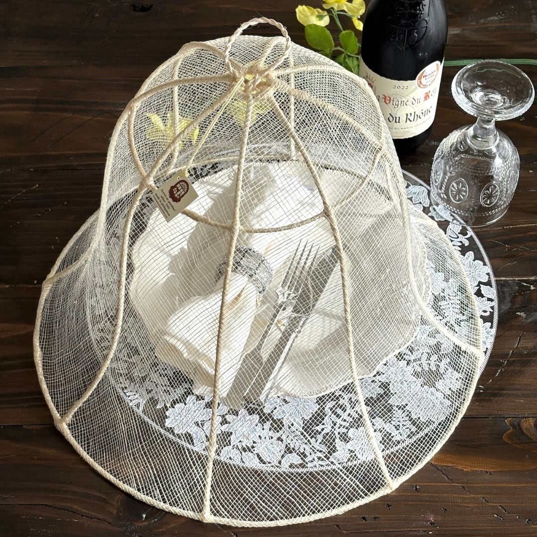 フルーツやお菓子などの常備品のカバーにすると、インテリアとして素敵ですし、テラスでのちょっとしたお食事やお茶の時間に、テーブルの小物を風から守ってくれる役割も果たします。