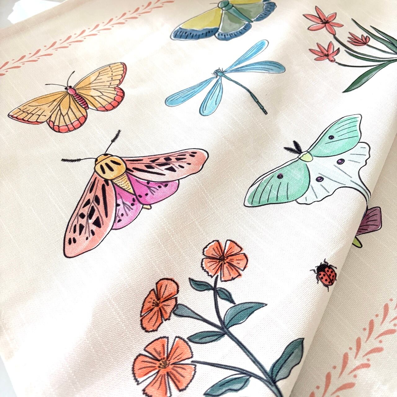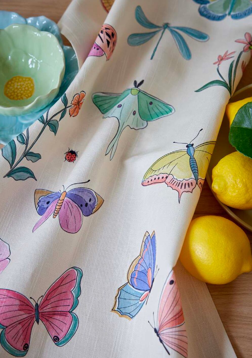 かわいい蝶々やトンボ、てんとう虫のプリントがついた綿麻混合のトルションです。