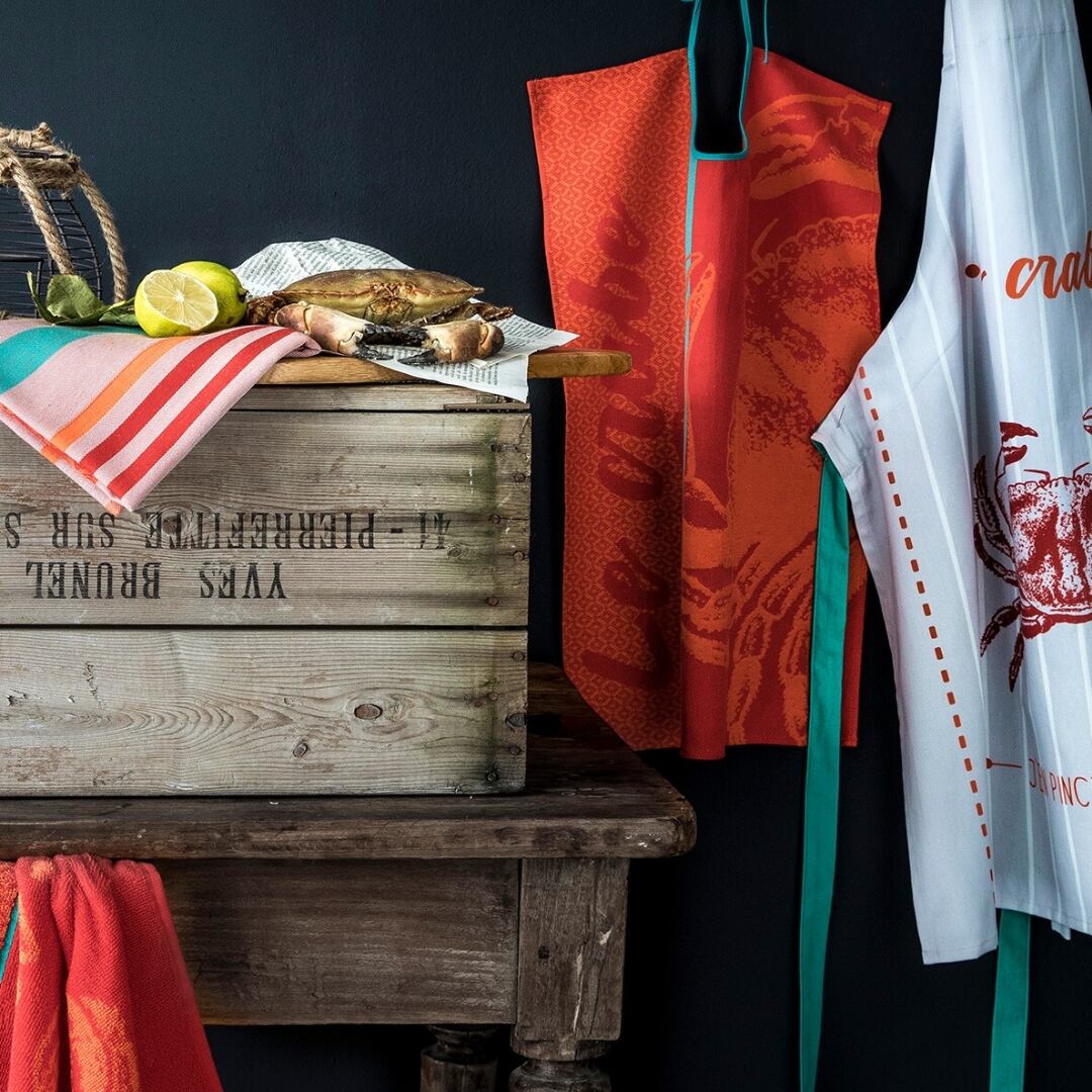 フランス直輸入の食事用エプロン「Le Crabe カニ」は、大人用のランチエプロンです。おうちでの日常の食事やお出かけ時の食事シーンで大活躍する一枚です。