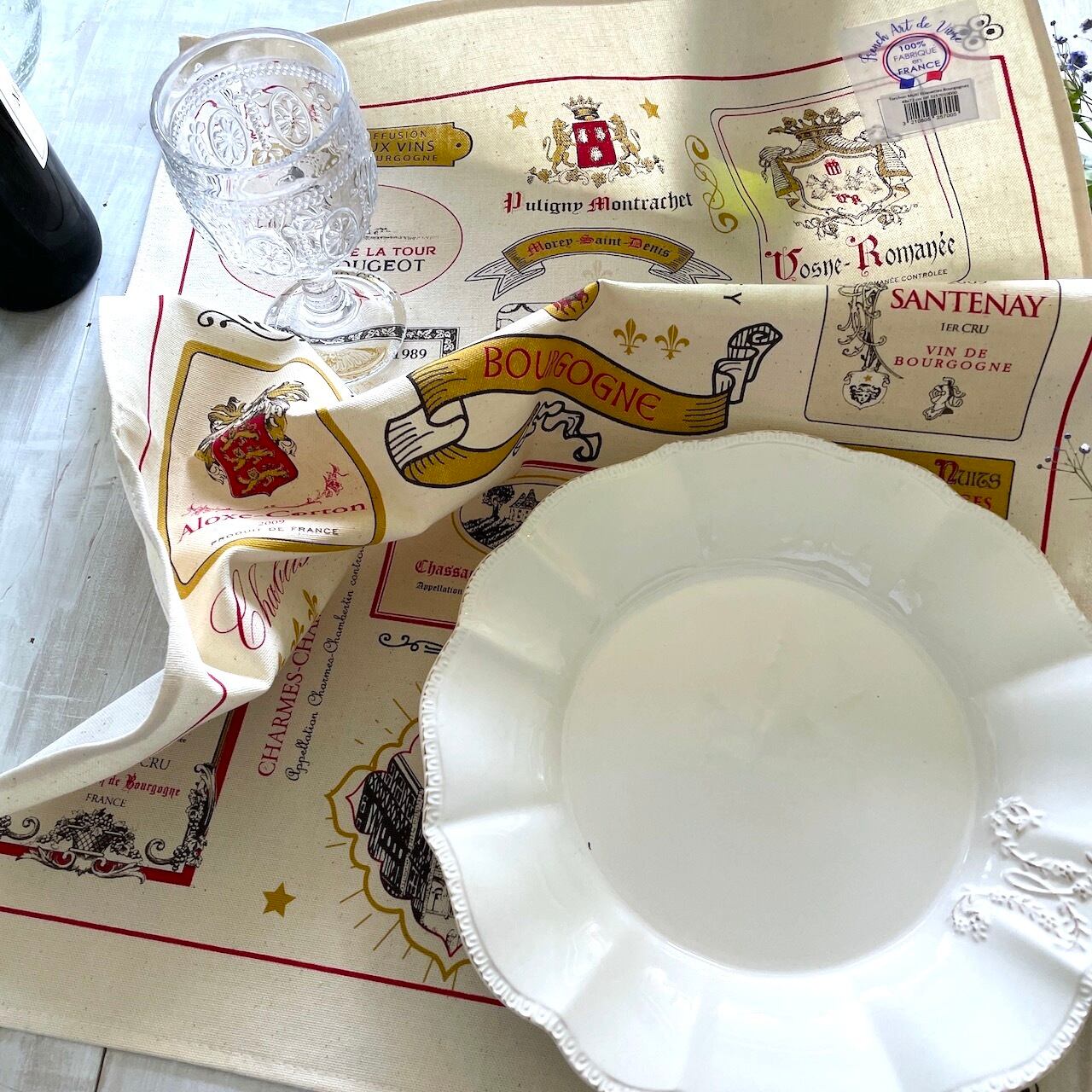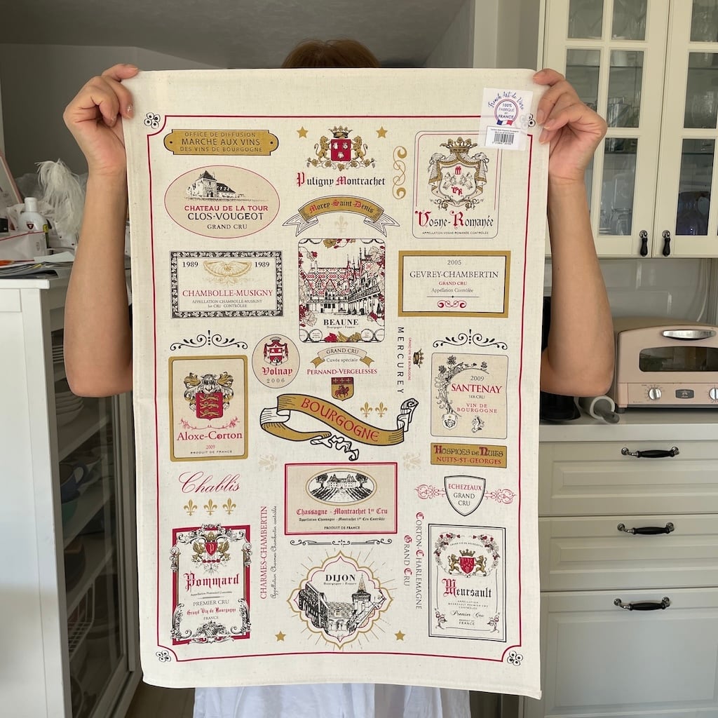 フランスのリネンブランドから、ブルゴーニュ地方のワインラベルをデザインしたおしゃれなキッチンクロスです。