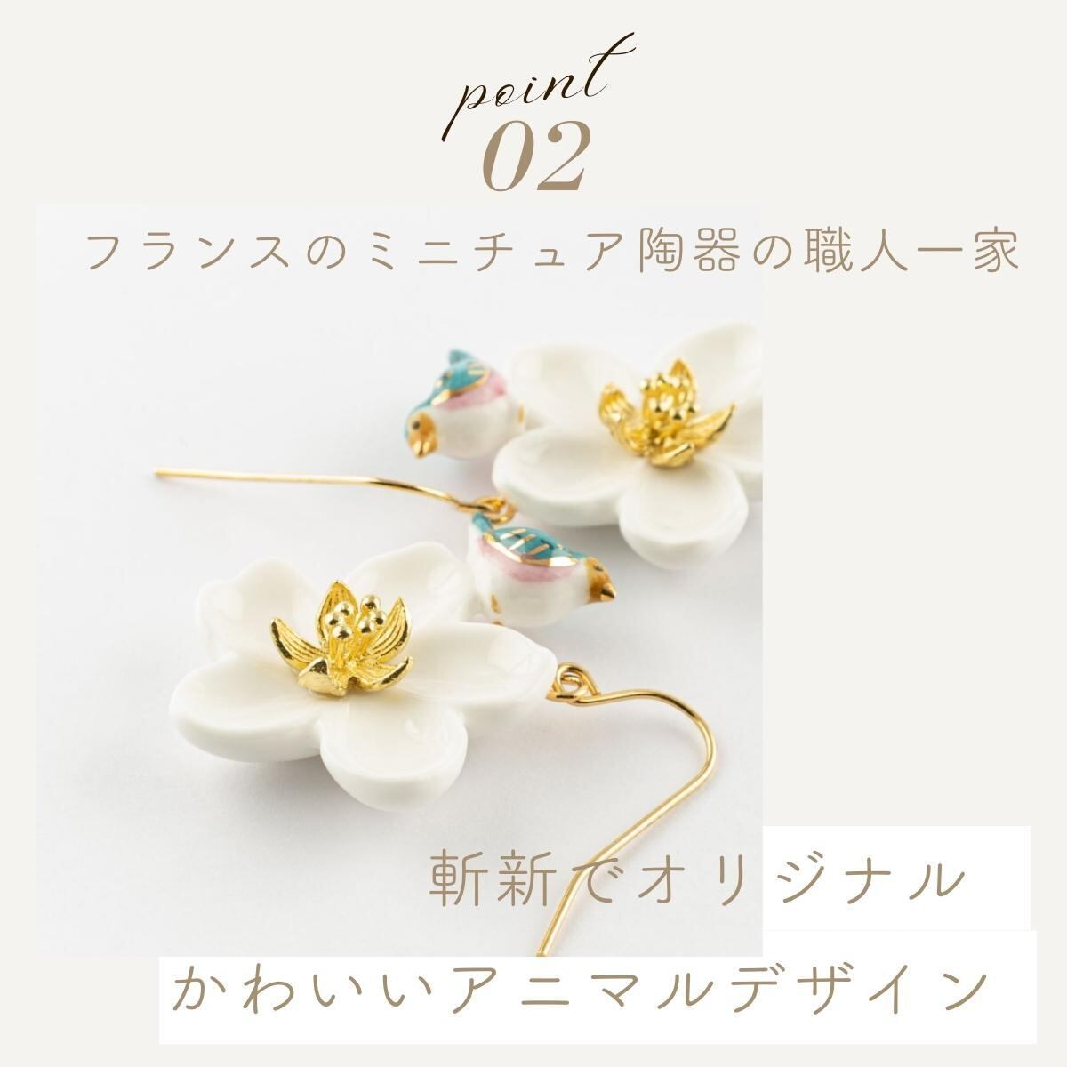 nach ナッシュ 【鳥と花】 ピアス フック式 24金メッキ パリ 旅行 ミニチュア陶器 アニマル レモン ギフト 陶芸 手描き 動物 かわいい おしゃれ 女性 彼女 プレゼント 誕生日 クリスマス 磁器 金 パリ ミニチュア アレルギーフリー