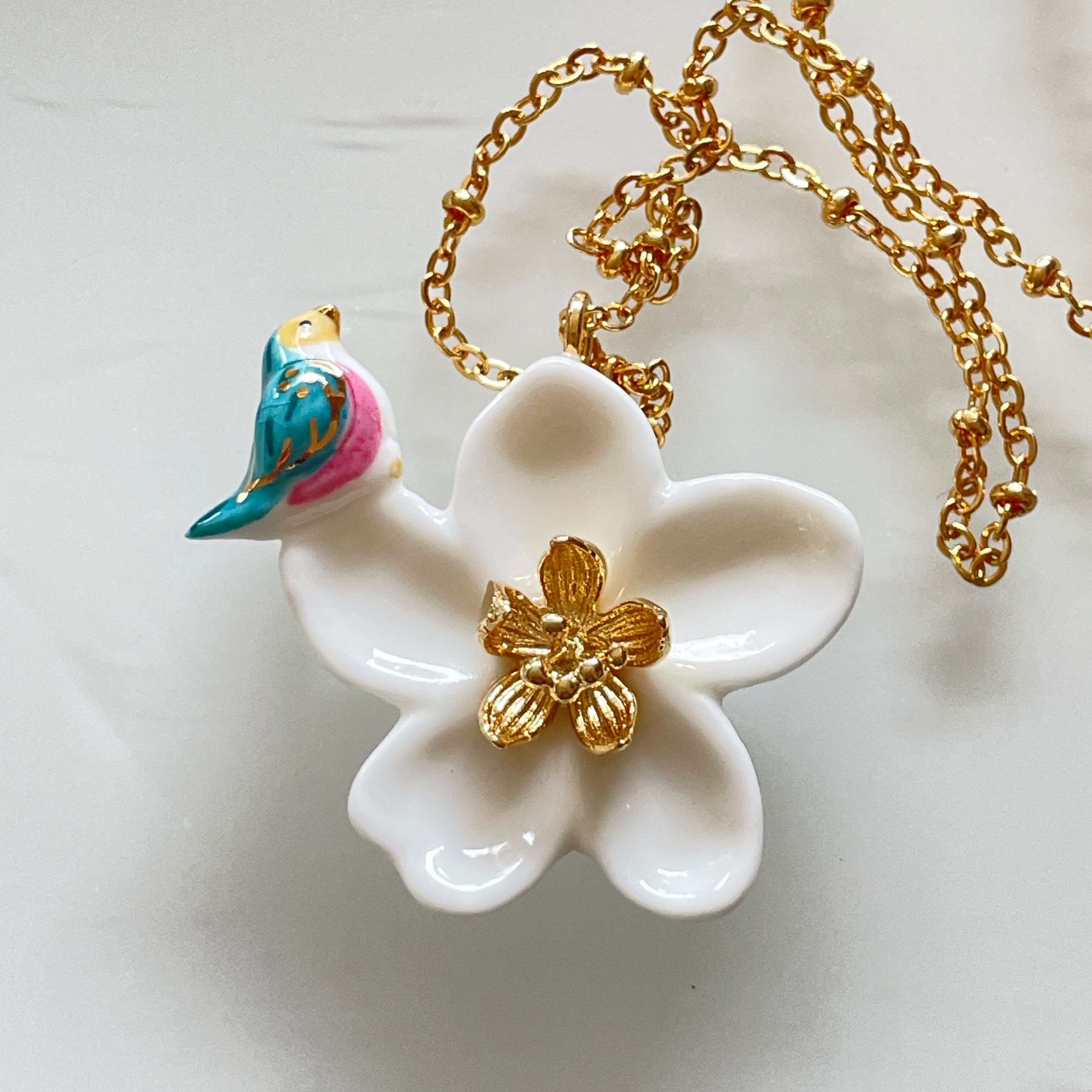 【SALE】nach ナッシュ 【鳥と梨の花】ペンダント ネックレス ミニチュア 24金メッキ 真鍮 陶器 アニマル ネックレス バード 鳥 花 ギフト プレゼント かわいい おしゃれ 女性 彼女 プレゼント 誕生日 ホワイトデー 磁器 金
