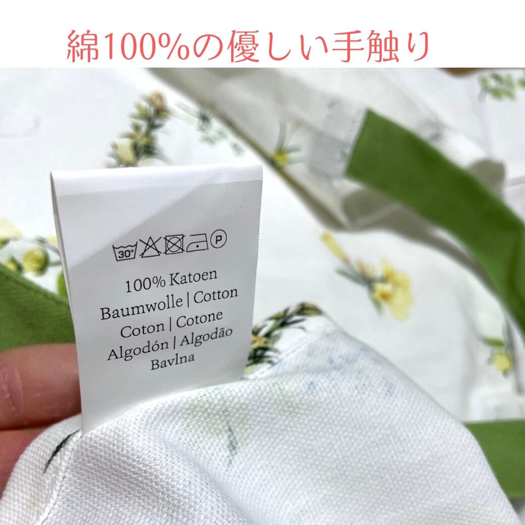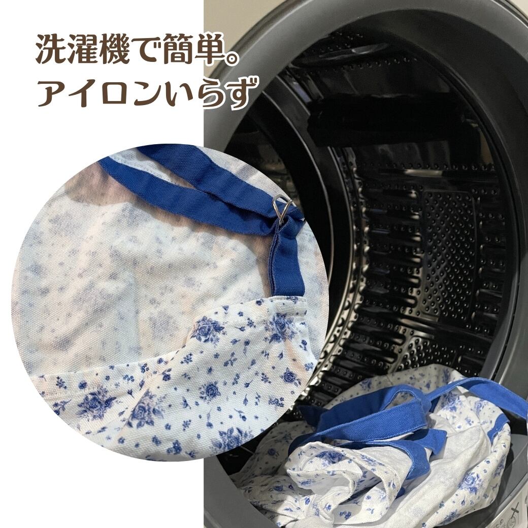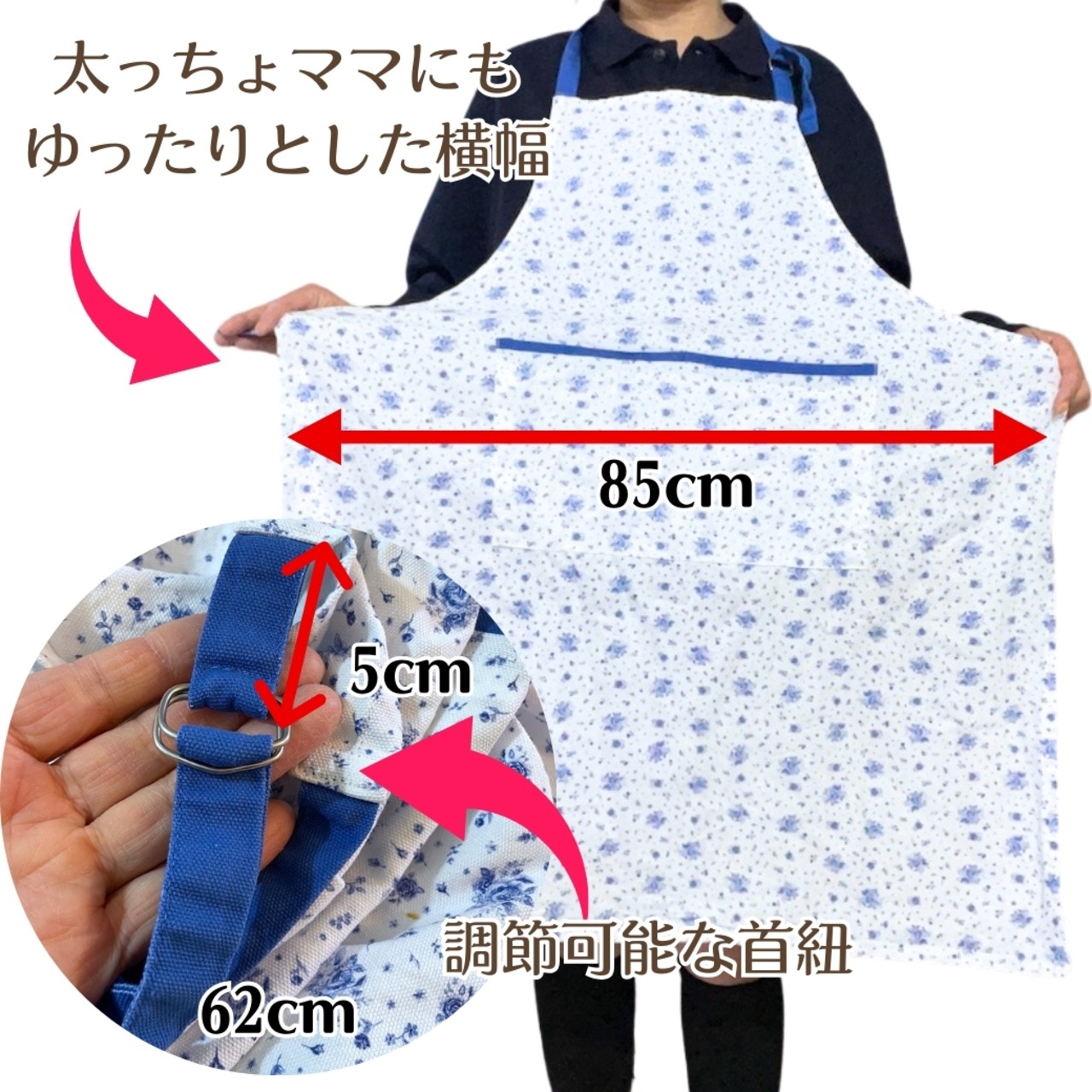 綿素材は毎日使える肌に優しいもののですが、生地は丈夫で洗濯機でのお洗濯でもしわがつきません。横幅が日本の平均的なエプロンよりも幅広の85センチ、腰紐も78cmのものが2本ついています。首紐は調節可能でこちらも最大65cmまで伸ばすことができます。